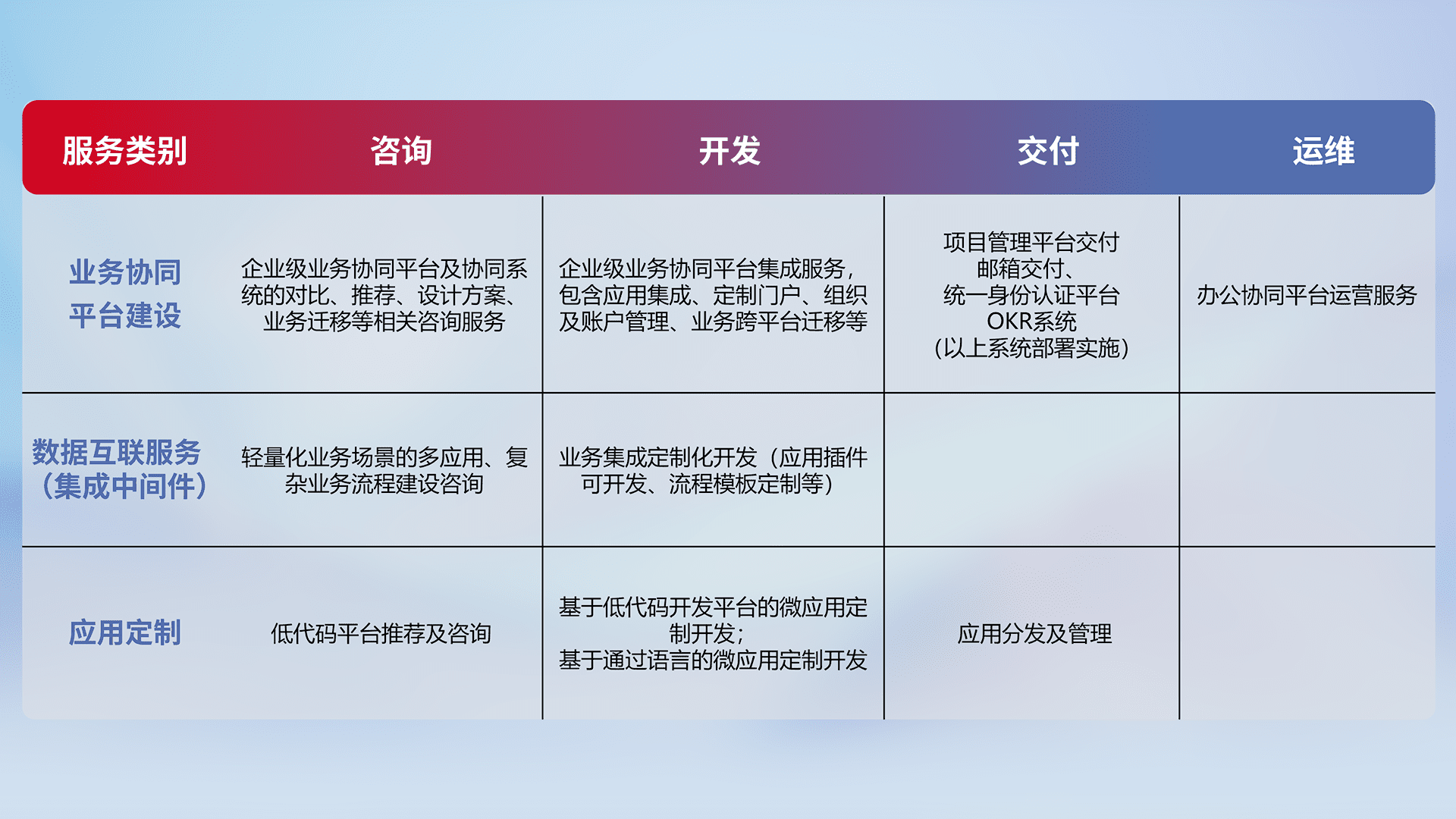 针对钉钉、、、、企微、、、IDaas等平台级产品提供产品的规划、、、方案、、、、交付、、、、定制化开发等服务,,,实现如统一协同办公、、、智能客户服务、、、混合会议管理、、、、智能数据查询、、等业务场景,,,,实现数字化转型。。。。