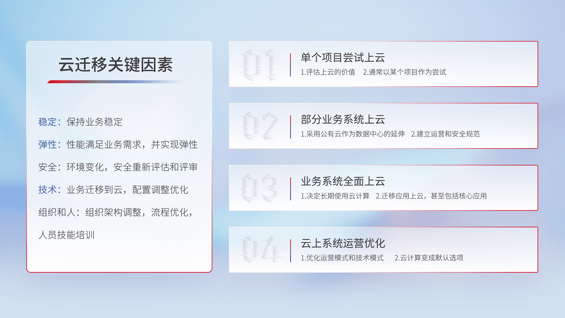 结合实际业务,,,从规划设计、、、云平台选型、、、、云原生改造、、、数据迁移、、、、集成交付,,,迁移全过程为客户识别最佳上云路径,,,,做好风险识别管理,,,,设计网络架构、、身份权限、、、、安全审计合规、、操作审计、、、、日志审计、、监控告警策略、、多站点容灾设计等,,,,对云上基础设施进行整体规划,,,,提升IT治理水平,,,,以满足弹性、、、、高可用、、高性能的需求。。。。