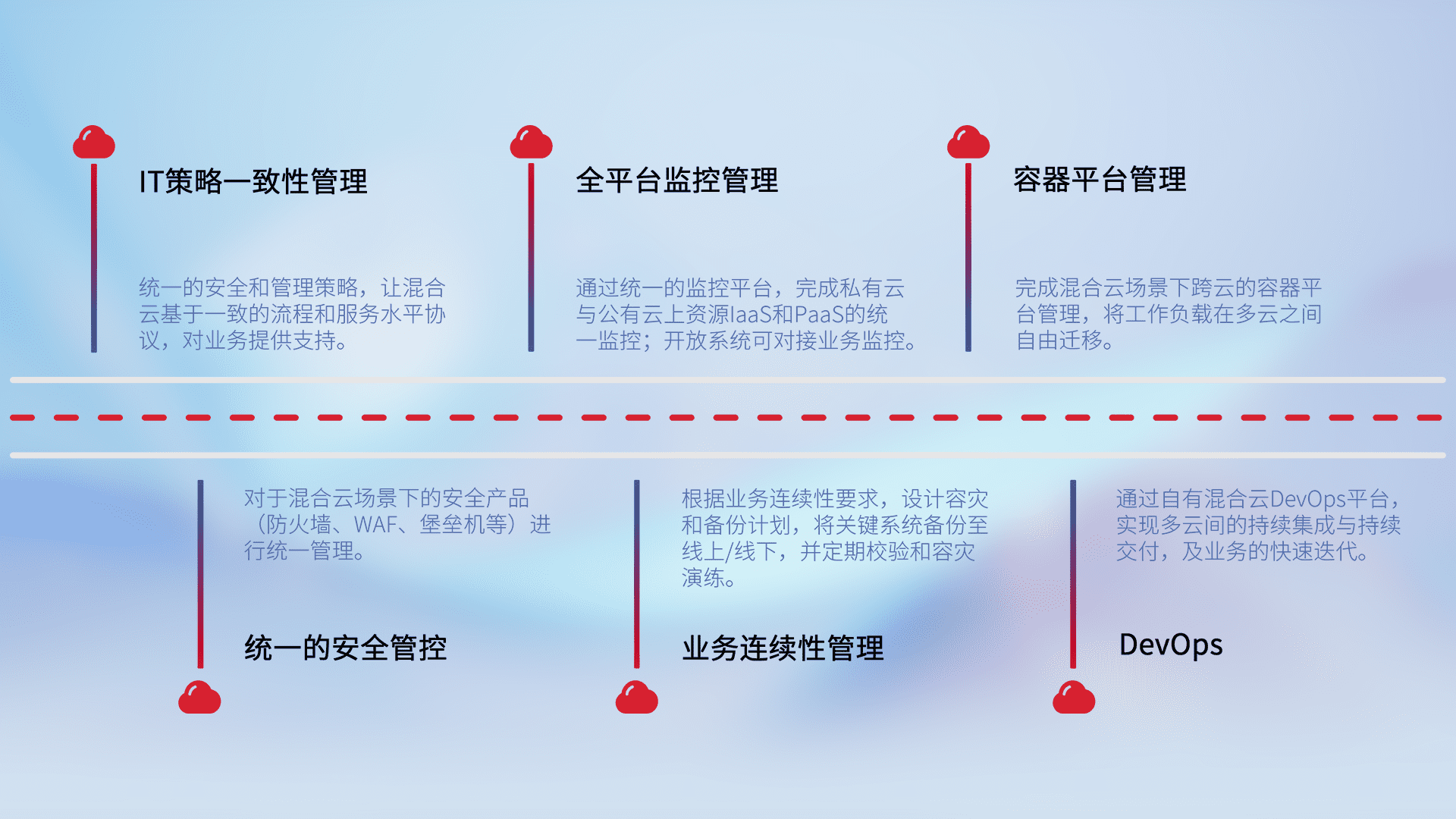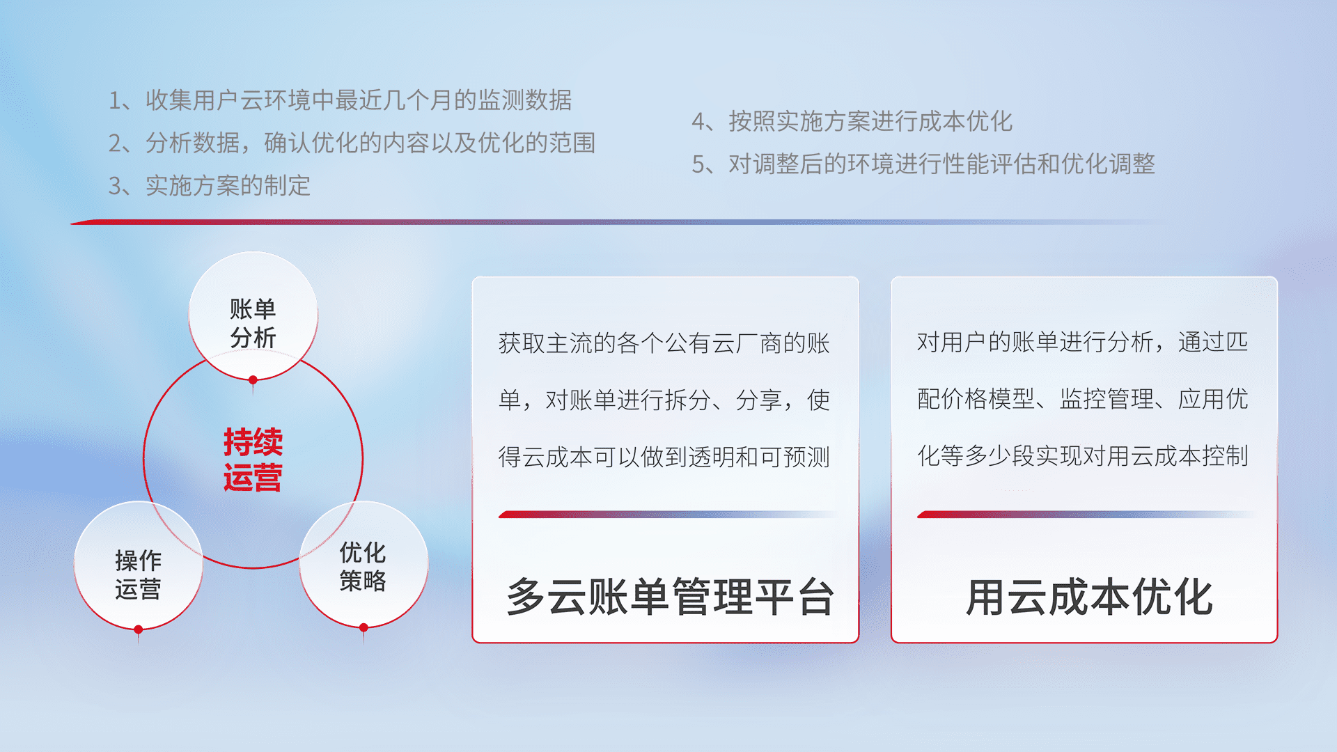 通过多云纳管,,,,以统一的资源数据模型把客户的云资源进行抽象和封装,,进而实现对多云资源的统一操作,,,,保障云资源管理的可靠性、、稳定性与可用性。。量身定制化运维内容,,配置、、、开发运维、、、、补丁管理、、备份、、、监控、、、认证和访问管理、、、、审计和日常巡检等,,,保障在用云过程中的可靠度,,,,稳定度以及高可用率。。